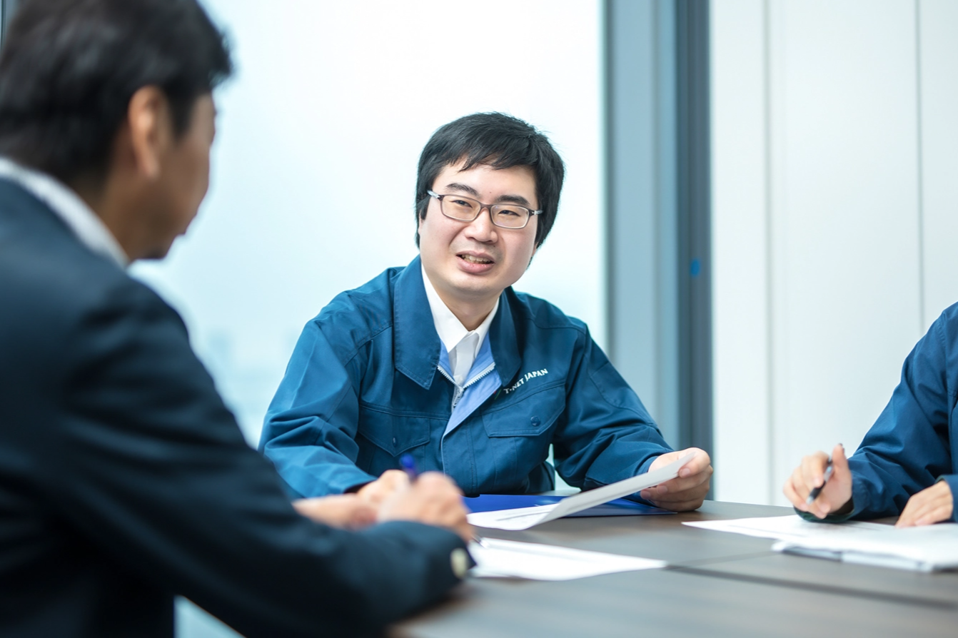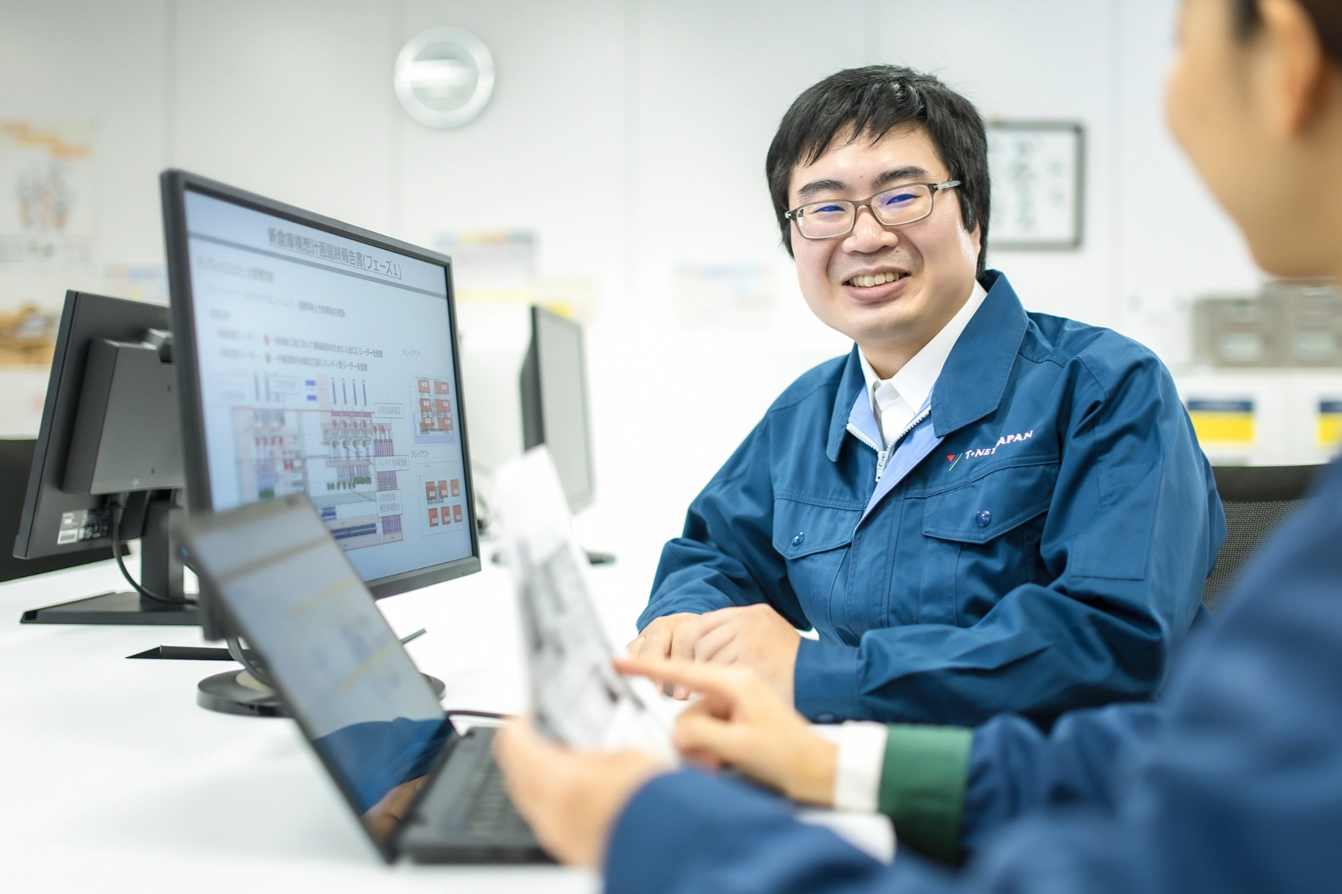 その後、ポリテクセンターで職業訓練を受けていた頃に、ティーネットジャパンの中途採用担当者からスカウトを受け、当社の仕事に興味を持ちました。工場向けの大型機械を一品一様に製作する点や、原子力・半導体分野といった、高い技術力を求められる製品を手がけている点に魅力を感じ、新鮮な気持ちで仕事が続けられると考え、入社を決意しました。配属後は、教育係である先輩の背中を見て学び、一つずつできそうな業務から取り組みながら、都度フィードバックをもらうことで、着実に成長できました。