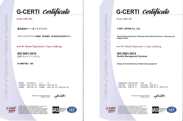 株式会社ティーネットジャパン(以下、「当社」)は、お客さまに提供する製品・サービスの品質を継続的に向上させることを社会的責任と認識しております。 当社は、2020年9月16日付けで、AES事業部(現プラントエンジニアリング事業部) 高松事業所を対象とした、品質マネジメントシステム(QMS)の国際規格である「ISO9001(品質)」の認証を取得いたしました。