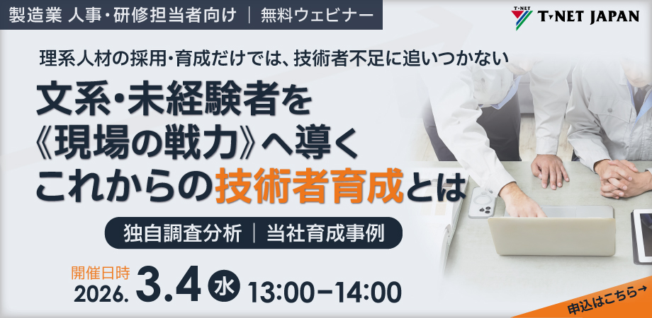 この度、ティーネットジャパンでは、製造業の人事・研修ご担当者様向けに、技術者育成に関する無料ウェビナーを3月4日(水)に開催いたします。