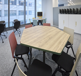 誰でも座れるフリーアドレス席を設置し、通常業務や打ち合わせなども可能な開放的なエリアを設置しております。誰もが気軽に訪れ、偶然の出会いを生むオープンなスペースです。 |