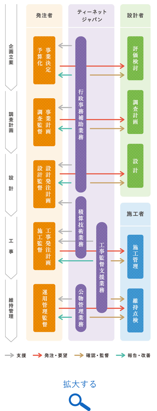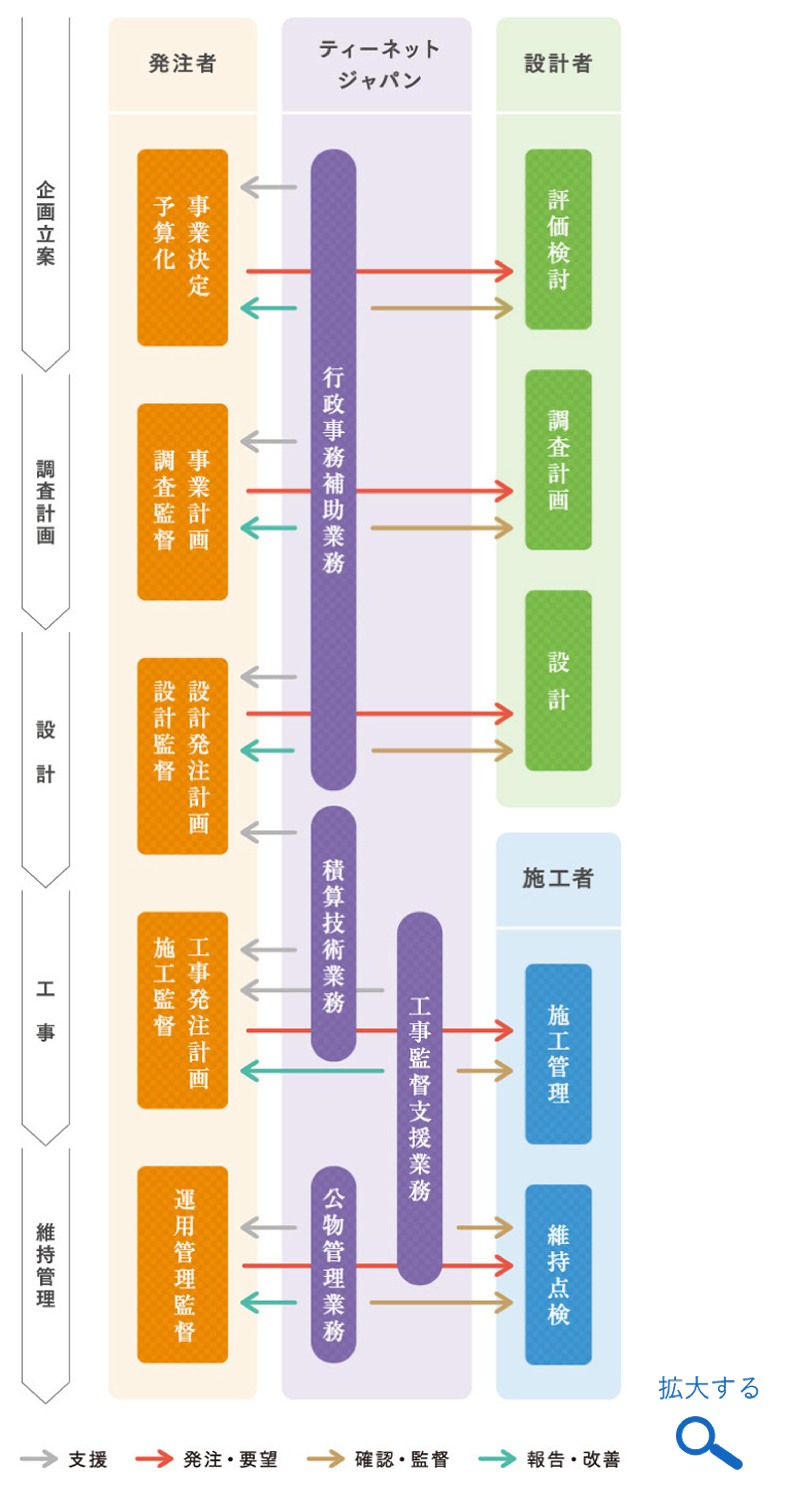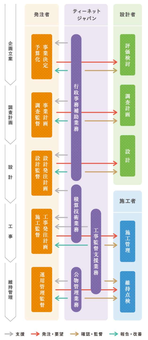 一方でティーネットジャパンは、設計や積算、工事などの特定分野だけでなく、「事業決定・予算化」「事業計画・調査監督」「設計発注・設計監督」「工事発注計画・施工監督」「運用管理監督」まで、すべての業務で実績があり、総合的に発注者を支援できる点に強みを持っています。