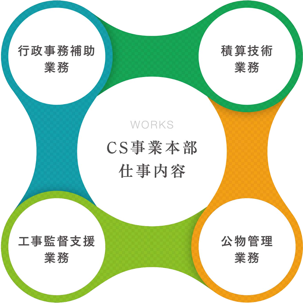 発注者支援業務には、「積算技術」「工事監督支援」「公物管理補助」「行政事務補助」などの業務があり、それぞれの技術領域で経験を深めてエキスパートを目指すことも、複数の業務を横断的に経験しながら、発注者支援業務を総合的に担うスキルを身につけることも可能です。