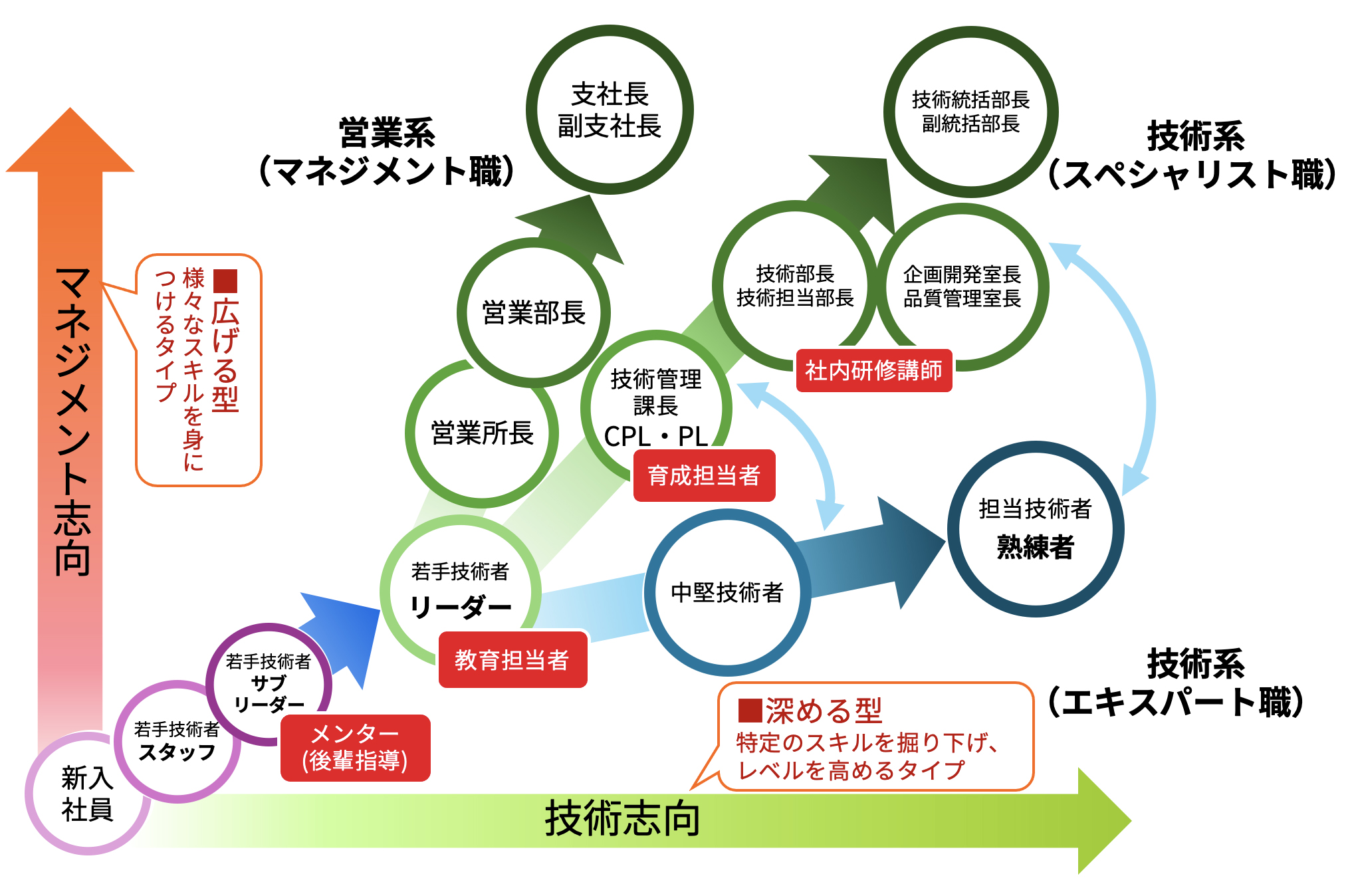 キャリアとしては、営業所長や支社長、管理技術者(PL)、技師長・技術推進室長、技術担当部長といったプロジェクト/組織管理を担う「マネジメント志向コース」と、技術の追求に専念してエキスパートを目指す「技術志向コース」の大きく2つの道があります。どちらの道を選ぶかに応じて、専門性の深化やマネジメント能力の獲得など、段階的にキャリアを形成していくことができることはもちろん、目指すべき自分を実現するための研修や資格取得支援、OJTなどの学びの機会も豊富に用意されています。