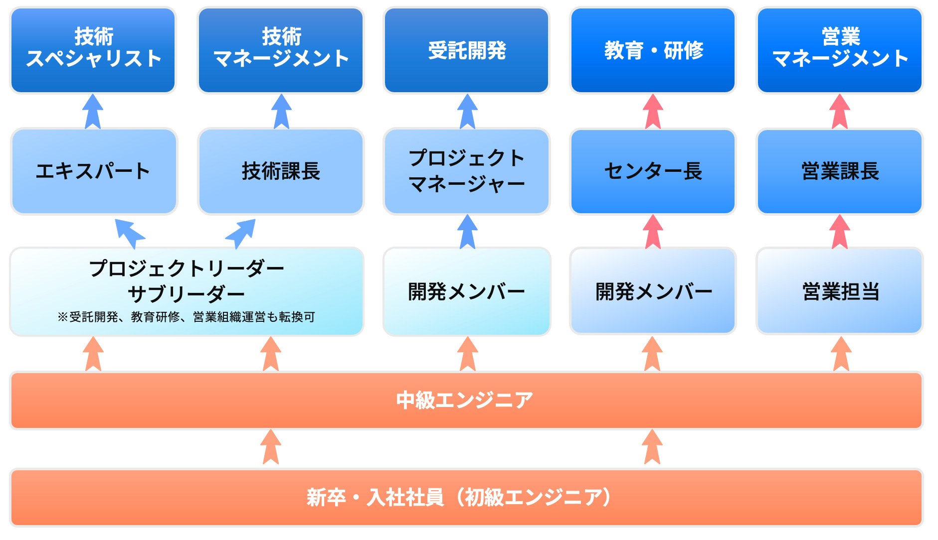 日本を代表する大手メーカーの開発業務に携わる事ができ、最先端の技術を獲得しながら業務遂行にあたれます。エンジニアとしてのキャリアをスタートさせたあとは、技術を極める「技術スペシャリスト」技術を広める「技術マネージメント」それぞれのプロジェクトに特化し、「受託開発」「教育・研修」「技術営業」へとキャリアを進める事が可能です。同時に様々なツールに携わる事でエンジニアとしてキャリアの幅を広げます。